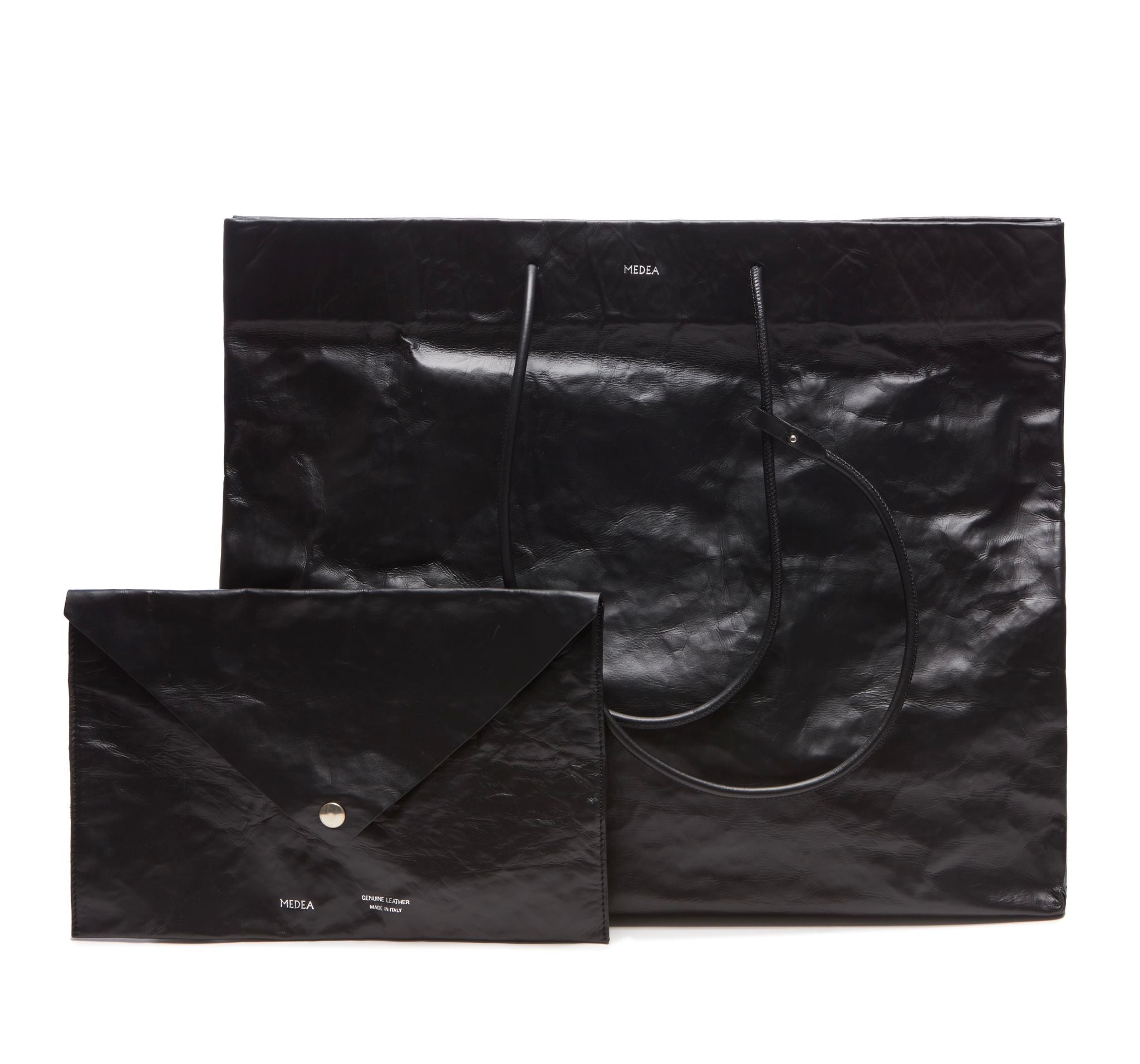 Matching leather envelope clutch included with snap button closure